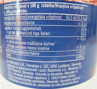 | Energijska vrednost | 56,5 / 13,3 kJ/kcal |