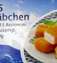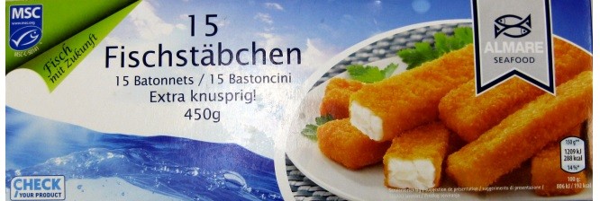 | Ime izdelka: | Almare seafood, 15 ribjih palčk posebej hrustljavih. Iz fileja aljaškega polaka (65 %) |