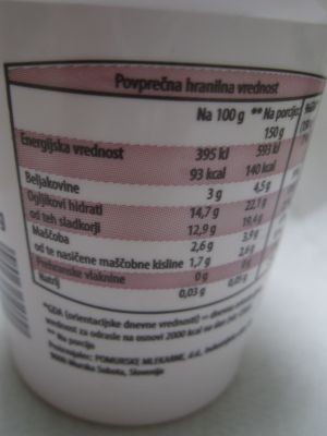 sestavine: pasterizirano fermentirano mleko3,2%mm, 15%sadnega pripravka(sladkor,višnjeva kaša40%,kislina:citronska kislina, gostilo:pektin,aroma