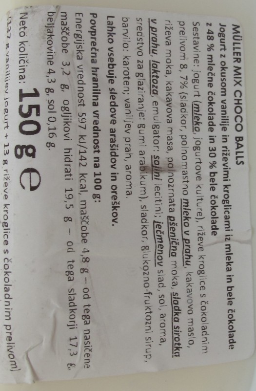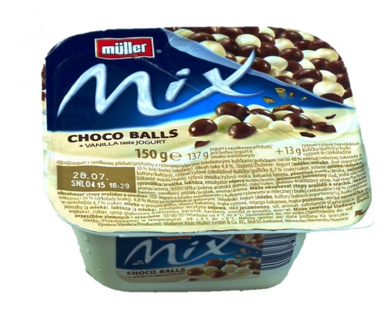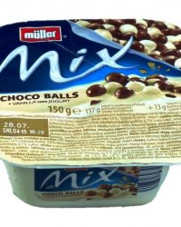 | Ime izdelka: | Müller mix choco balls. Jogurt z okusom vanilije in riževimi kroglicami iz mleka in bele čokolade z 48 % mlečne čokolade in 30 % bele čokolade |