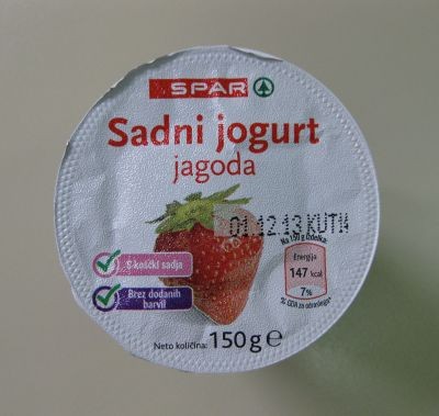 Sadni jogurt Spar Jagoda Vroče Vnešeno: Januar 14, 2014 1.5 Vsebnosti na 100 g živila Maščobe 2,9 g Nasičene mašč. kisl. 1,8 g Sladkor 14 g Sol 0,125 g Energijska vrednost98 / 414 kJ/kcal Ogljikovi hidrati14,5 g Natrij0,05 g Komentar Jogurt iz pasteriziranega mleka (3,5 % m. m.), jagode in jagodni sok iz zgoščenega soka (6 %), sladkor, glukozni-fruktozni sirup, mlečne beljakovine, zgoščeni sok rdeče pese, aroma. Opis izdelka Blagovna znamka, ime: Sadni jogurt Spar Jagoda Ime izdelka:Sadni jogurt Proizvajalec, trgovec:Proizvedeno v EU za Spar Slovenija. Tweet