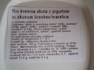 | Ime izdelka: | Bio kremna skuta z jogurtom in okusom breskev / marelica | |