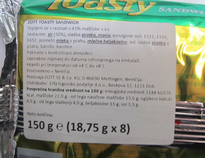 Zott Toasty sandwich, Topljeni sir v rezinah |
