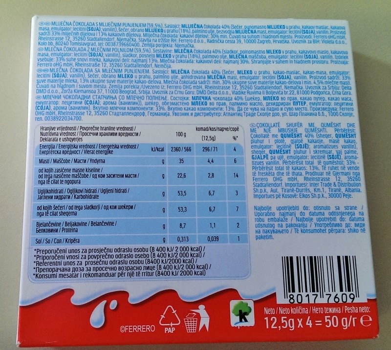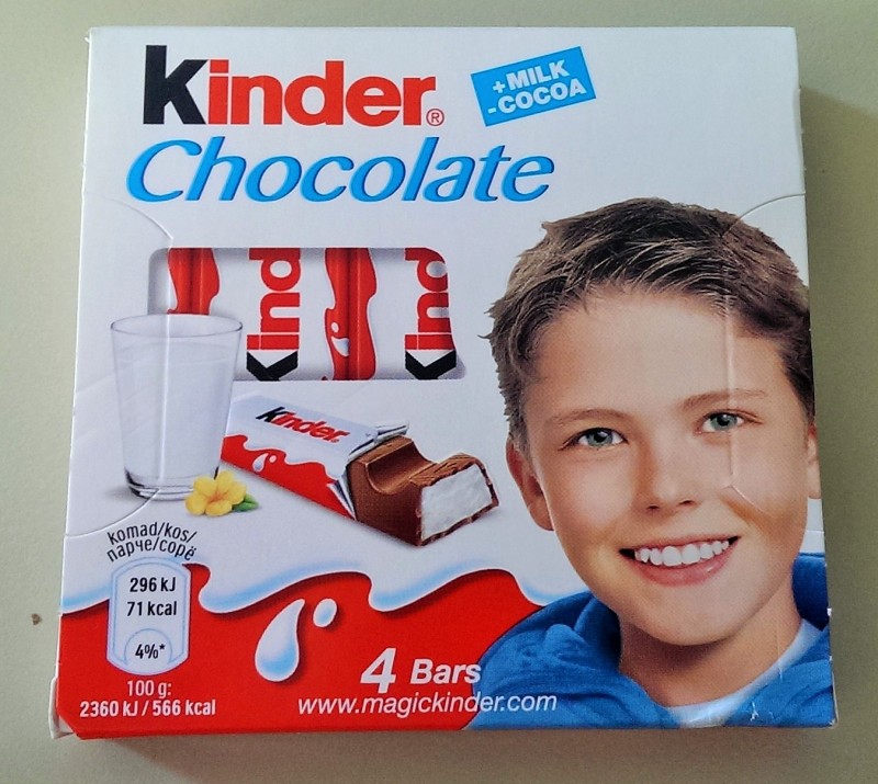 | Blagovna znamka, ime: | Kinder chocolate, mlečna čokolada z melčnim polnilom | |