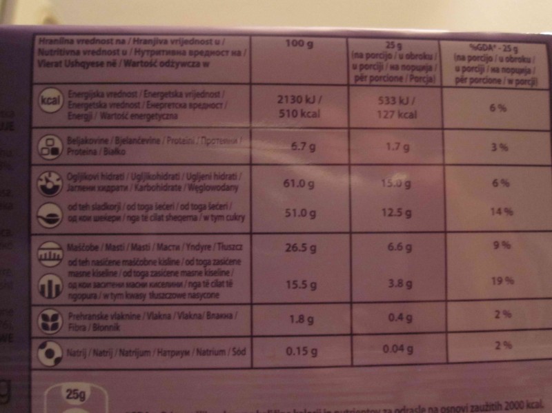 Milka - choco & rice, čokolada z rižem Vroče Vnešeno: Januar 27, 2011 2.8 Vsebnosti na 100 g živila Maščobe 26,5 g Nasičene mašč. kisl. 15,5 g Sladkor 51 g Sol 0,38 g Vlaknine 1,8 g Energijska vrednost2130/510 kJ/kcal Ogljikovi hidrati61 g Natrij0,15 g Beljakovine 6,7 g Komentar 100 gramov izdelka vsebuje 90% dnevne potrebe sladkorja in 25% energijske (kalorij) ter 40% dnevne potrebe po maščobah odrasle ženske , ki porabi dnevno 2000 kcal energije. Opis izdelka Blagovna znamka, ime: Milka - choco & rice, čokolada z rižem Ime izdelka:čokolada z rižem Proizvajalec, trgovec:Kraft Foods Črtna koda:7622300329914 Tweet