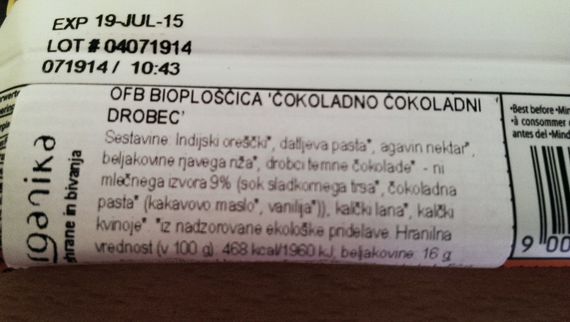 | Blagovna znamka, ime: | Ploščica s čokoladnim drobljencem, Raw organic | |